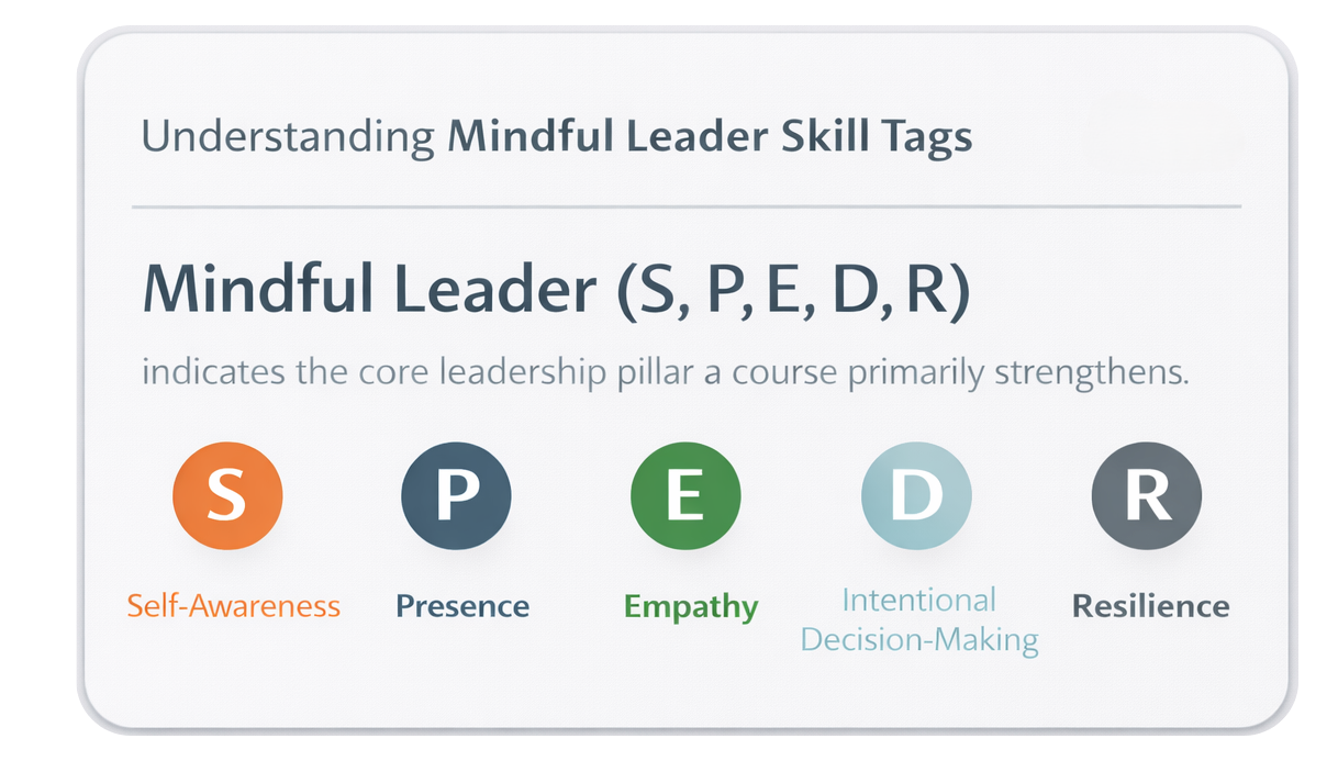 Every course is tagged to the primary Mindful Leader™ pillar it strengthens, so you can build skills intentionally and track your growth over time.